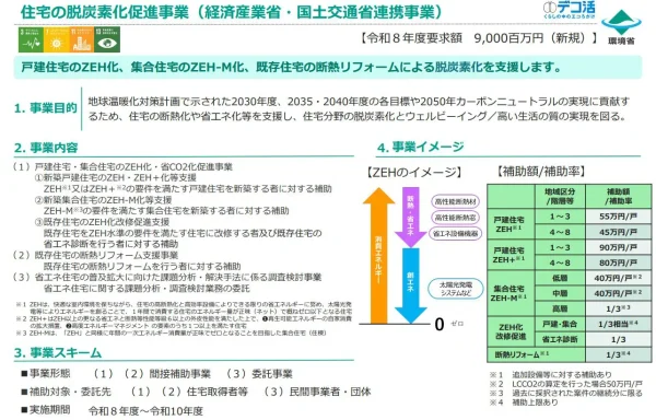 環境省の令和8年度概算要求内容としては、今年度同様に経済産業省・国土交通省との3省連携で住宅の脱炭素促進事業として住宅の高断熱化や省エネ化を支援する方針で、具体的な金額も明示されております。